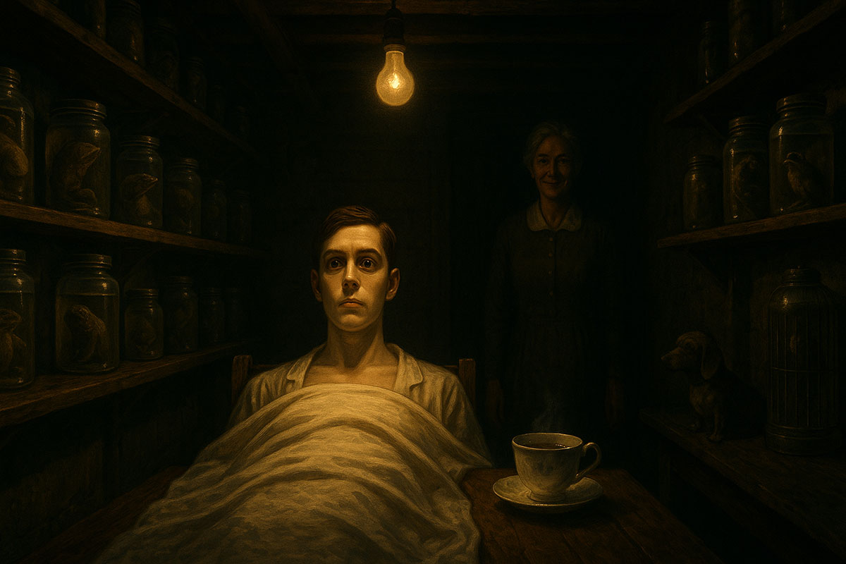 The landlady takes the new guest’s coat. The house inhales. A kettle answers in the kitchen with punctual affection.