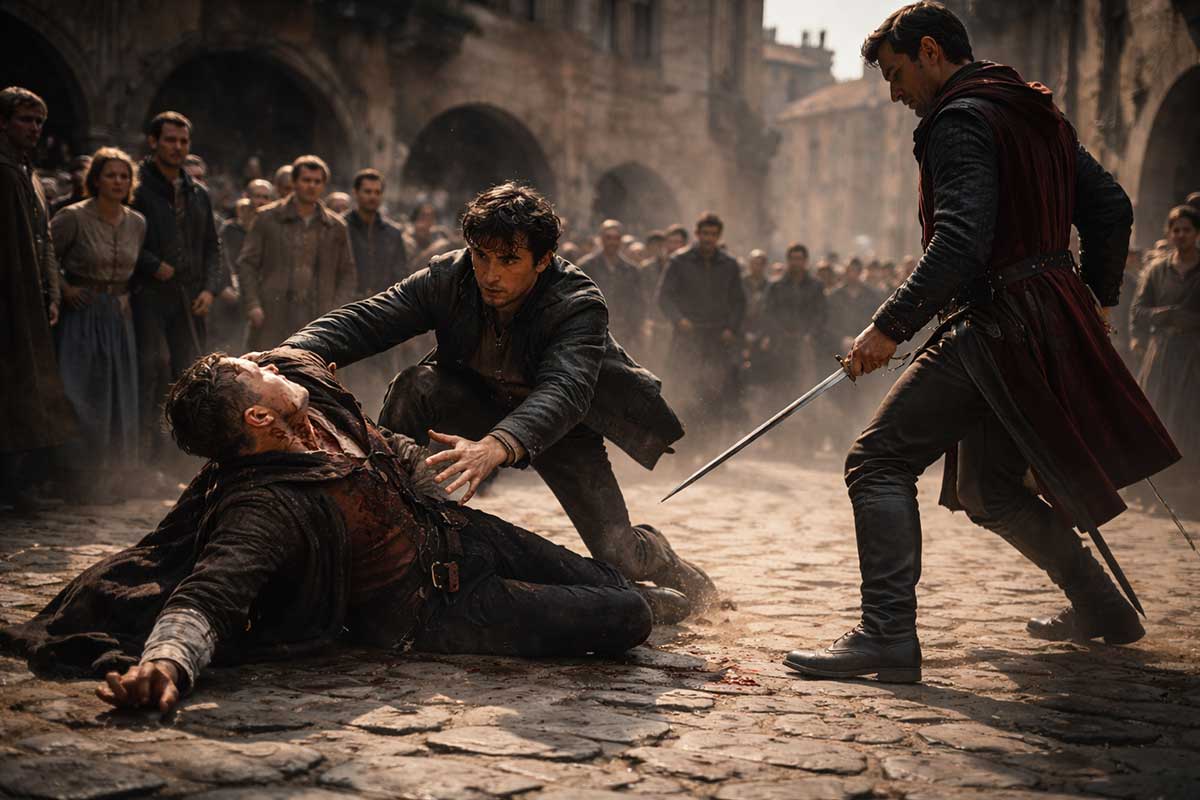 Mercutio’s death is pivotal. It happens in a moment where playfulness slips into violence. A pause there — a single breath — might have saved him. Instead, speed converts bravado into fatality.