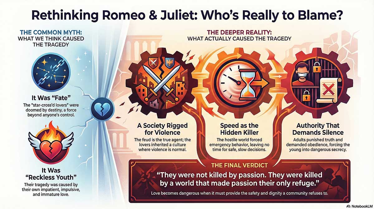 They search for a villain because grief demands a shape. But tragedy is rarely generous enough to offer a single culprit. In Romeo and Juliet, blame scatters — across people, customs, decisions, and silences.