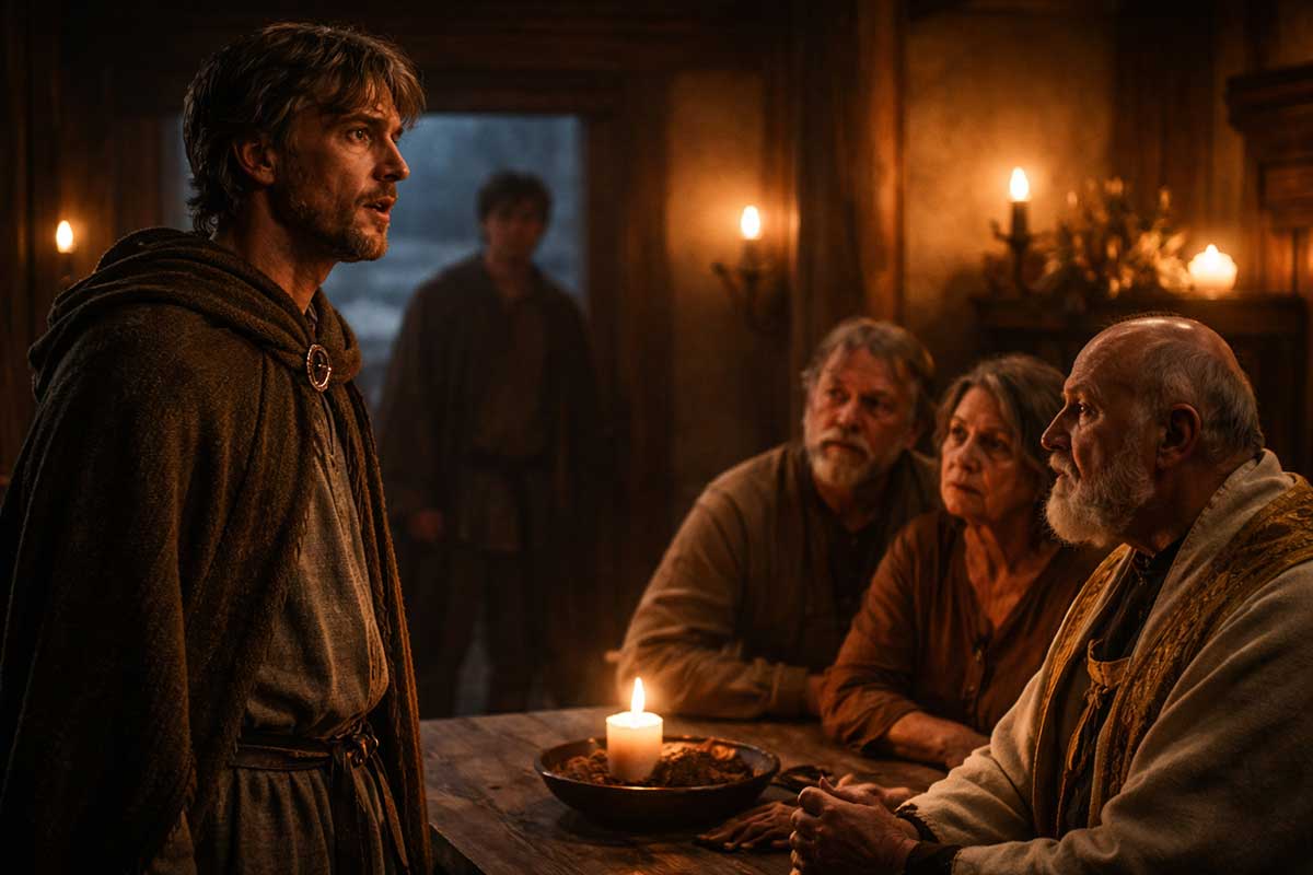 A simple home. A bench. A cloak hanging near the door. A wooden table with bread and a cup. Far off, gulls and waves. The stage should hold peace, but only for a moment.