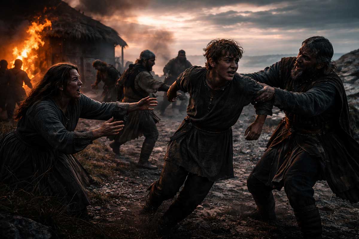 The western coast of Roman Britain, late afternoon. A cold wind. A modest Christian household near the edge of open land. Beyond it, the sea. The light is gold at first, but fading.