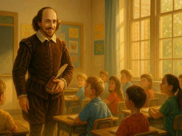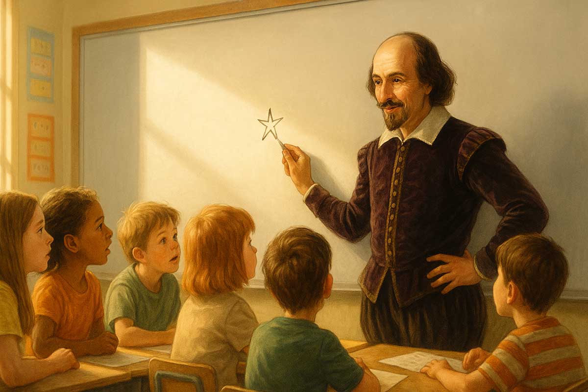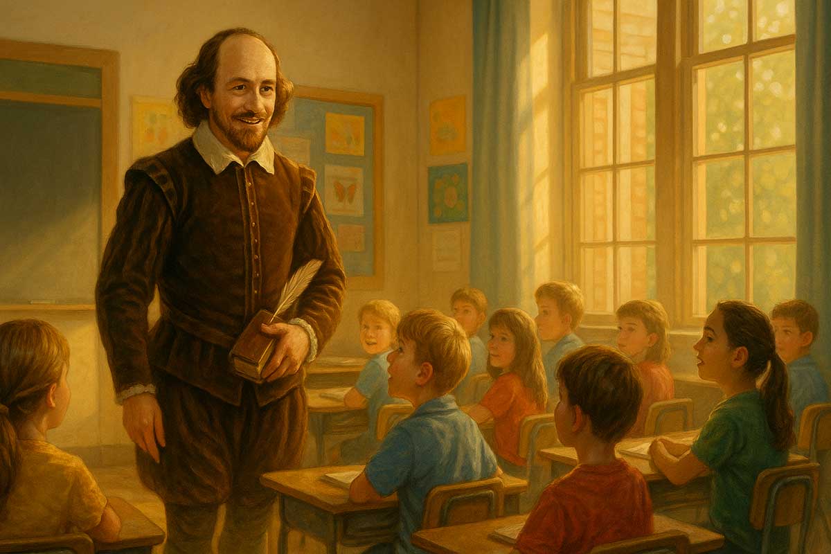 Shakespeare leans against the chalkboard, tapping a soft rhythm with two fingers.