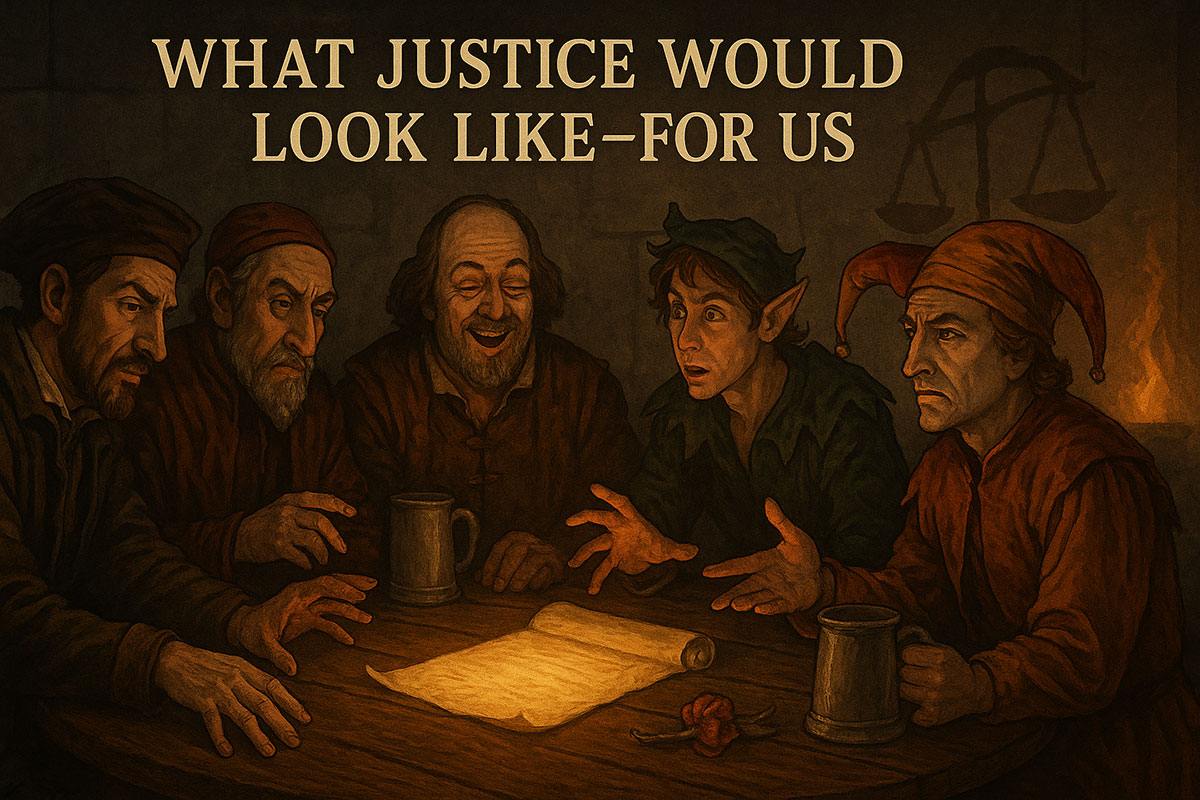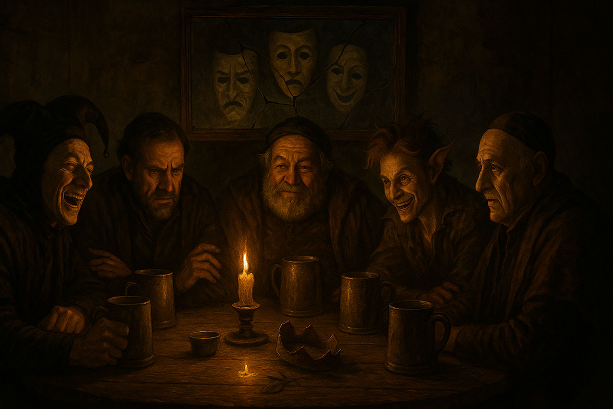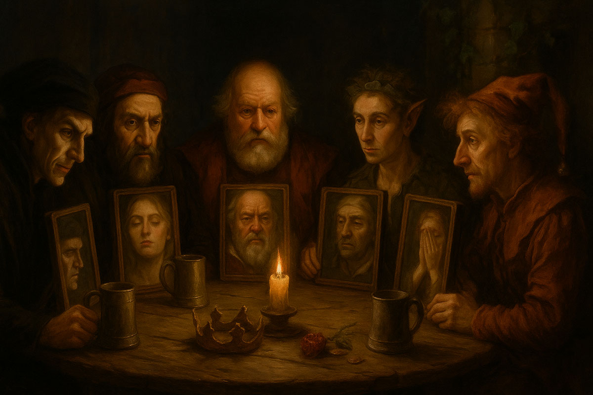 The tavern is nearly empty. Chairs are askew. The fire has burned low, but glows enough to show five figures still seated—not with the posture of jesters, but with the presence of prophets. This is not about survival now. It’s about choice. If they had their story to live again—would they step into the light… or walk right back into the dark?