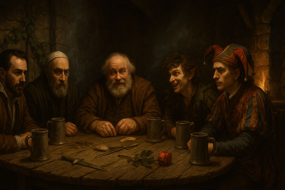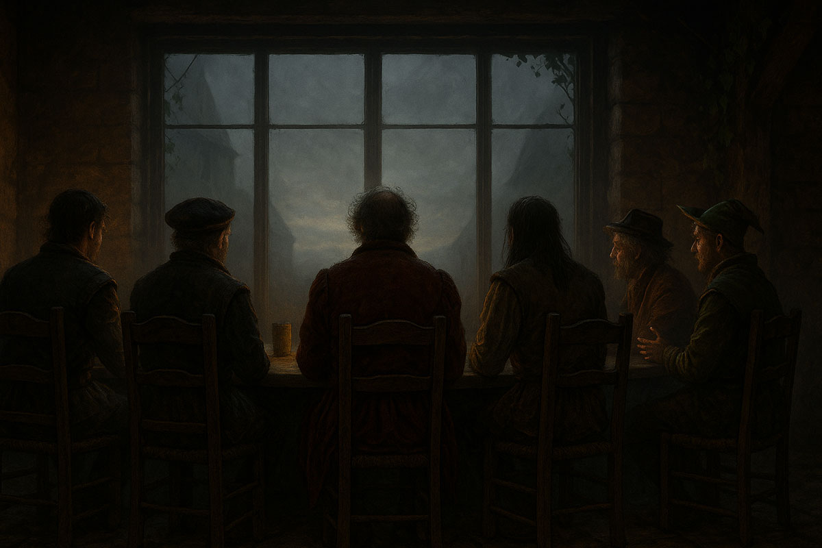 The tavern grows quieter. The smoke thickens. Someone has bolted the door. Outside, rain taps the shutters. Inside, five men lean into their own shadows. No laughter now—only the soft clink of mugs and the creak of old truths about to rise.