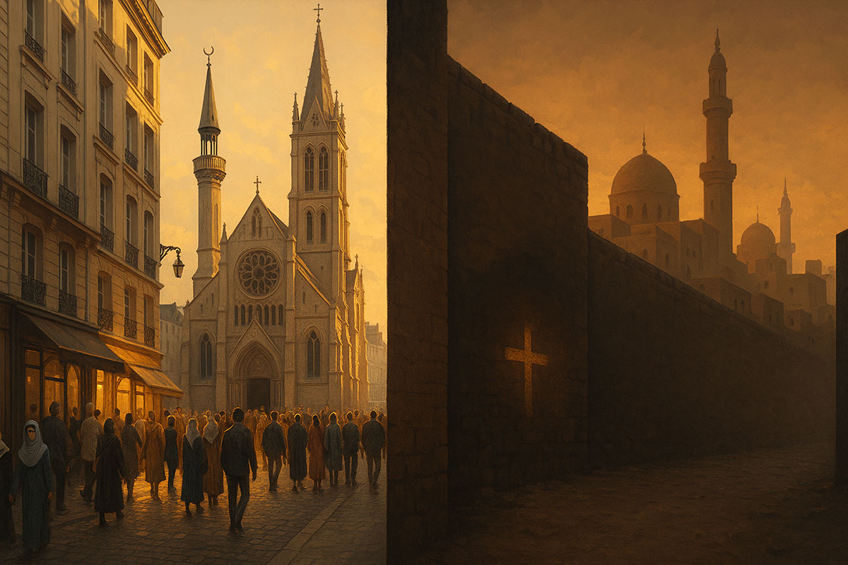 Welcome, friends. Today we embark on a journey through one of the most profound paradoxes of our time: the asymmetry of tolerance between Europe and the Middle East. In Europe, Muslims worship freely, build mosques, and shape cultural life openly. Yet in many Middle Eastern countries, Christians cannot do the same — restricted to private prayer, silenced in public, and barred from influencing the wider culture.
