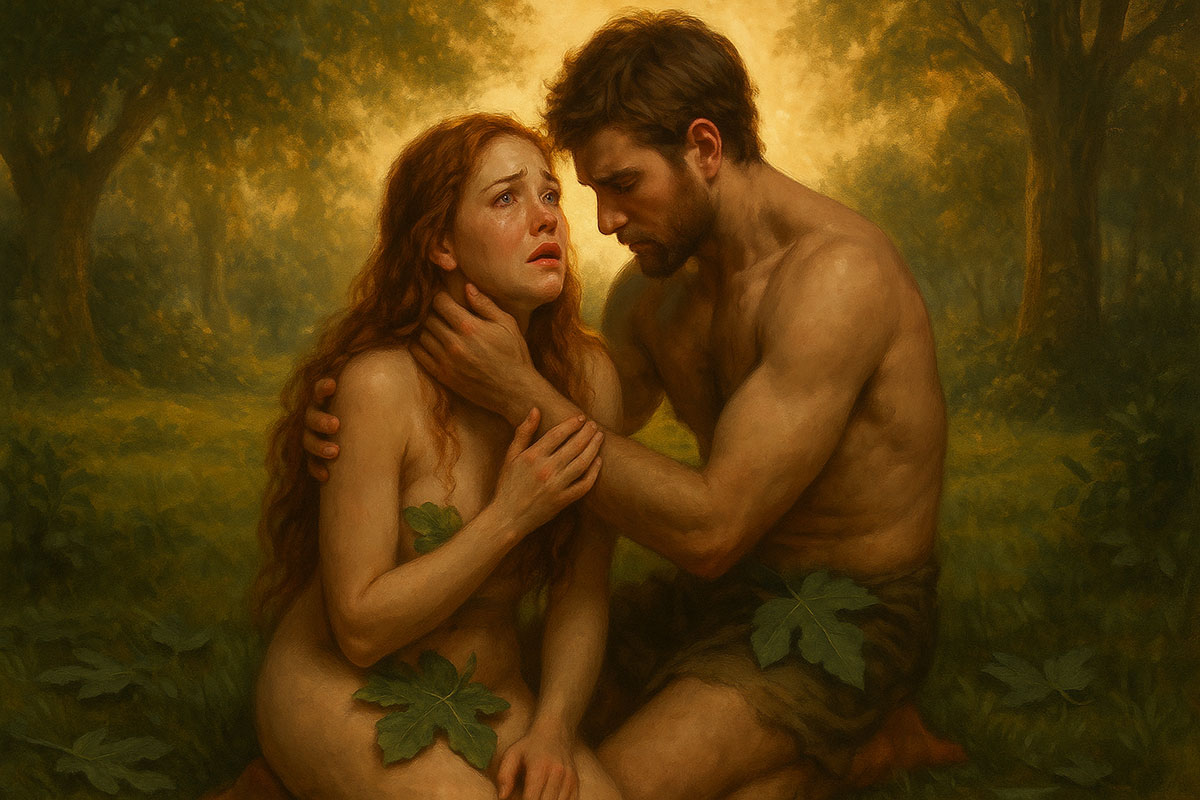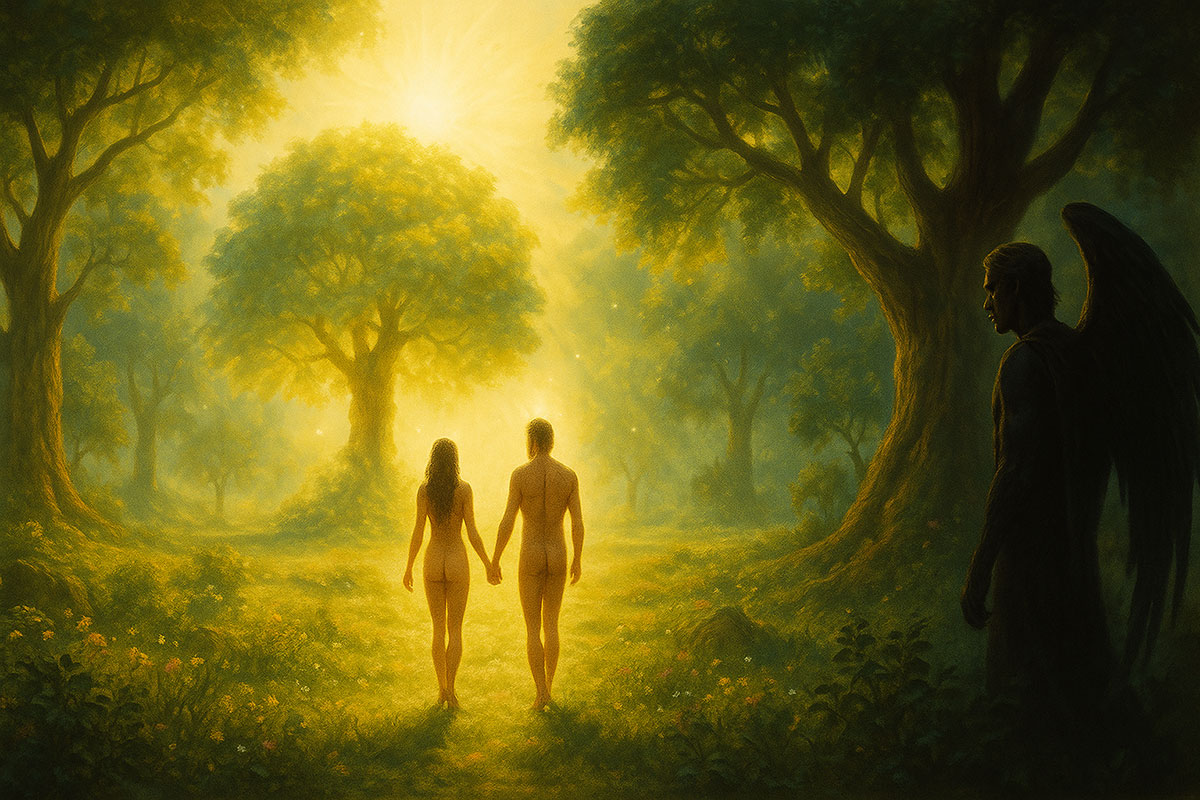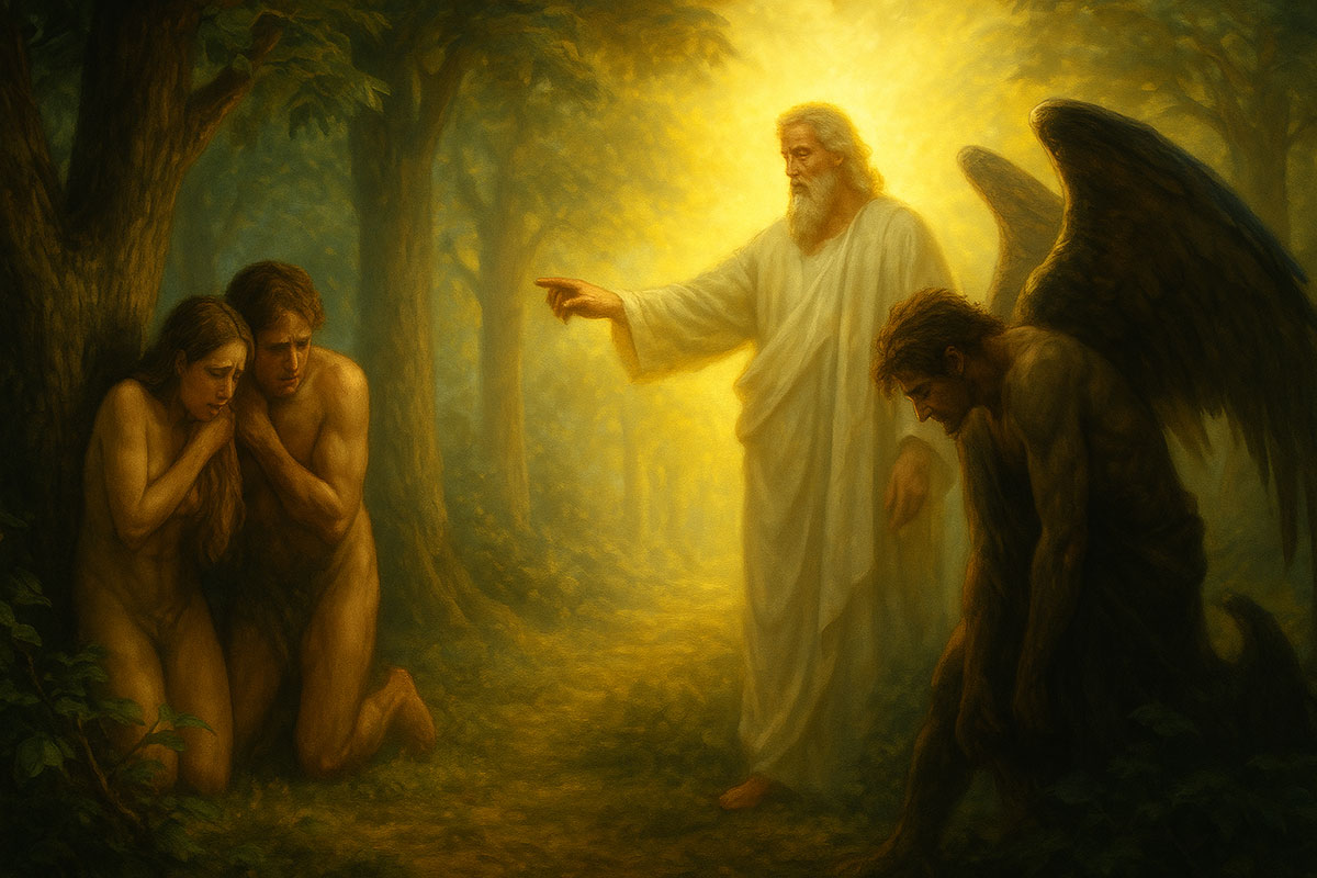 [Adam and Eve stumble forward, clothed in their makeshift coverings. They look back at the garden, radiant yet unreachable, guarded by angels. God’s voice lingers, tender as a father weeping over children he must discipline.]