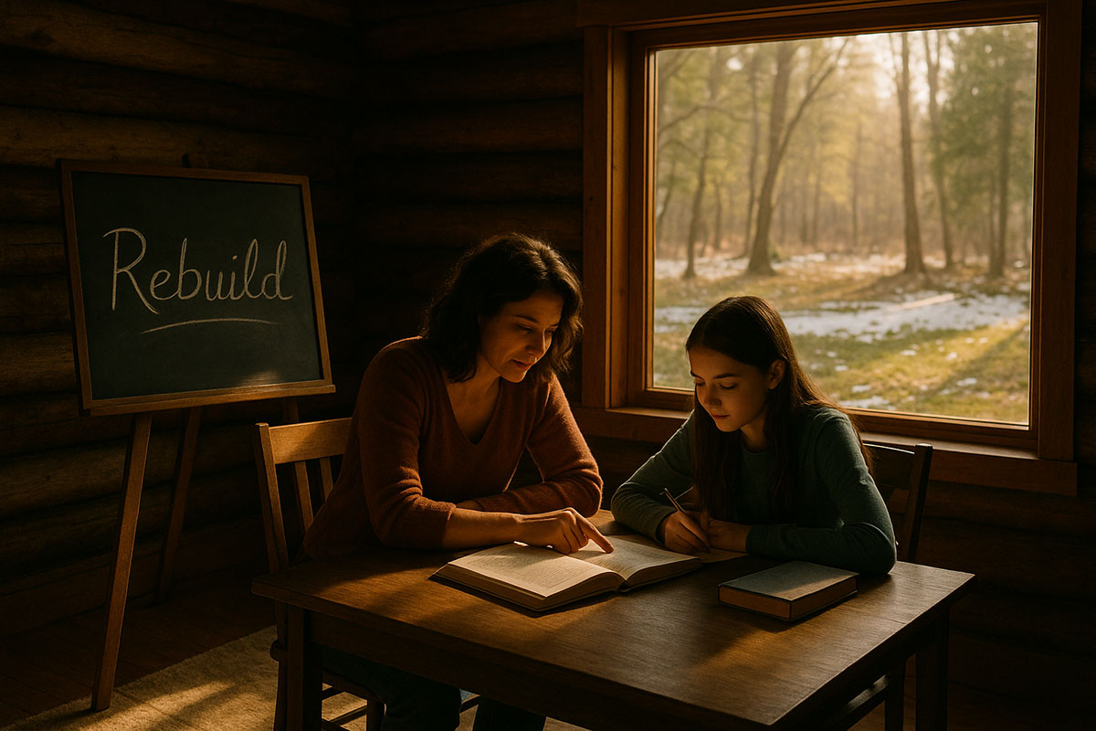 The cabin looks lived-in, almost warm. A chalkboard leans against the wall: in big chalk letters, the word “REBUILD.”