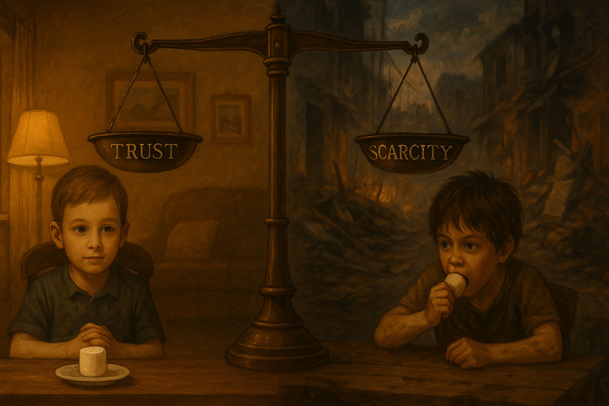 The marshmallow experiment revealed that trust in the future shapes whether a child waits or not. But I want to begin by asking: How much does scarcity, poverty, and lived experience affect our willingness to delay gratification compared to individual willpower?