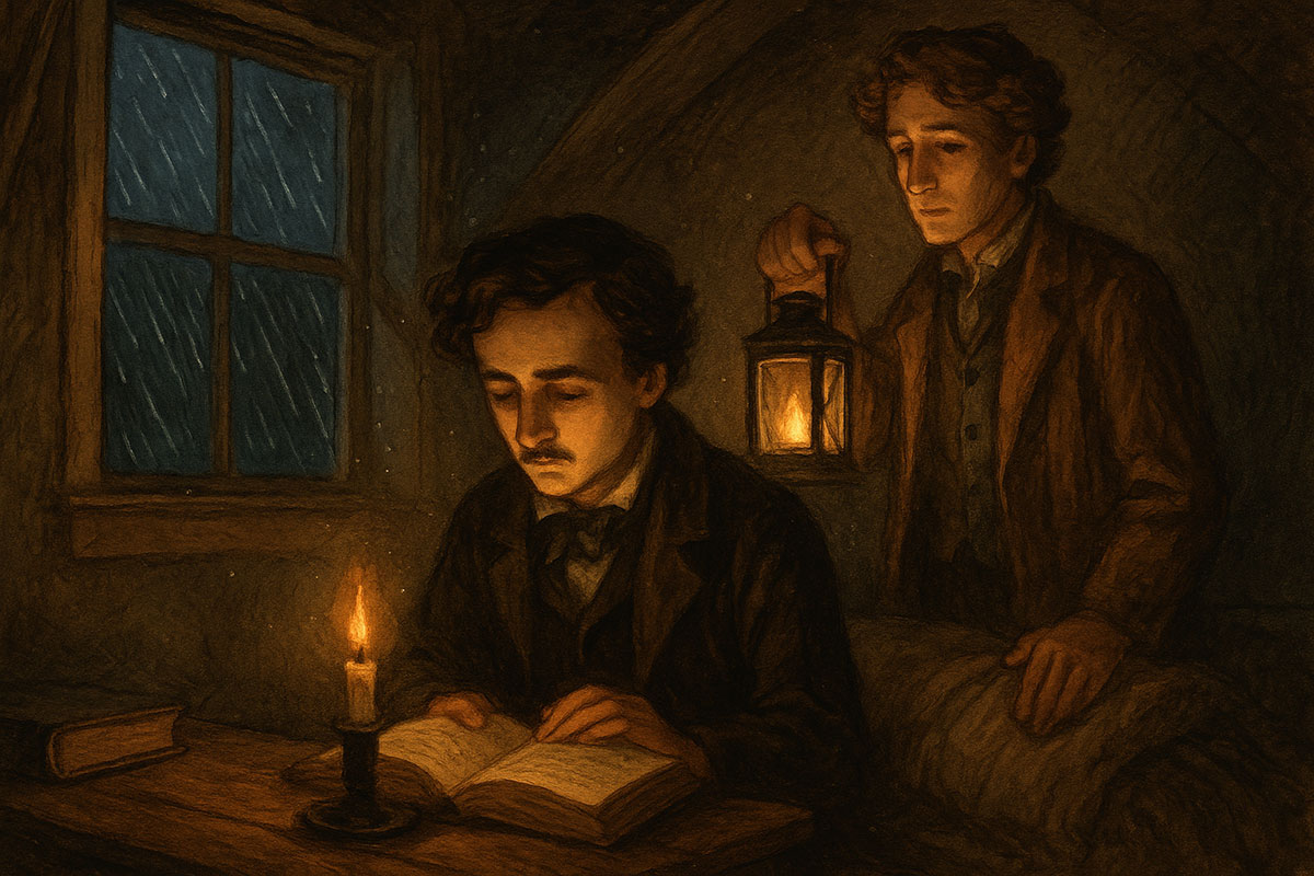 It was a late winter evening in the boarding house, the kind of night when the cold crept into your bones no matter how tightly you wrapped your coat. The lamplight in Edgar’s small room was the only warm thing about it — a fragile glow fighting back the shadows. Outside, a bare-limbed tree tapped its bony fingers against the glass as if asking to be let in.