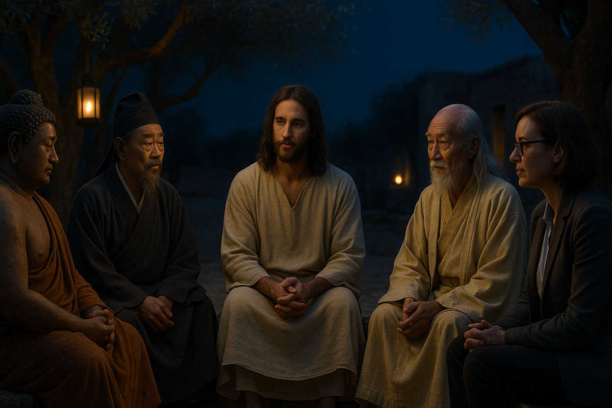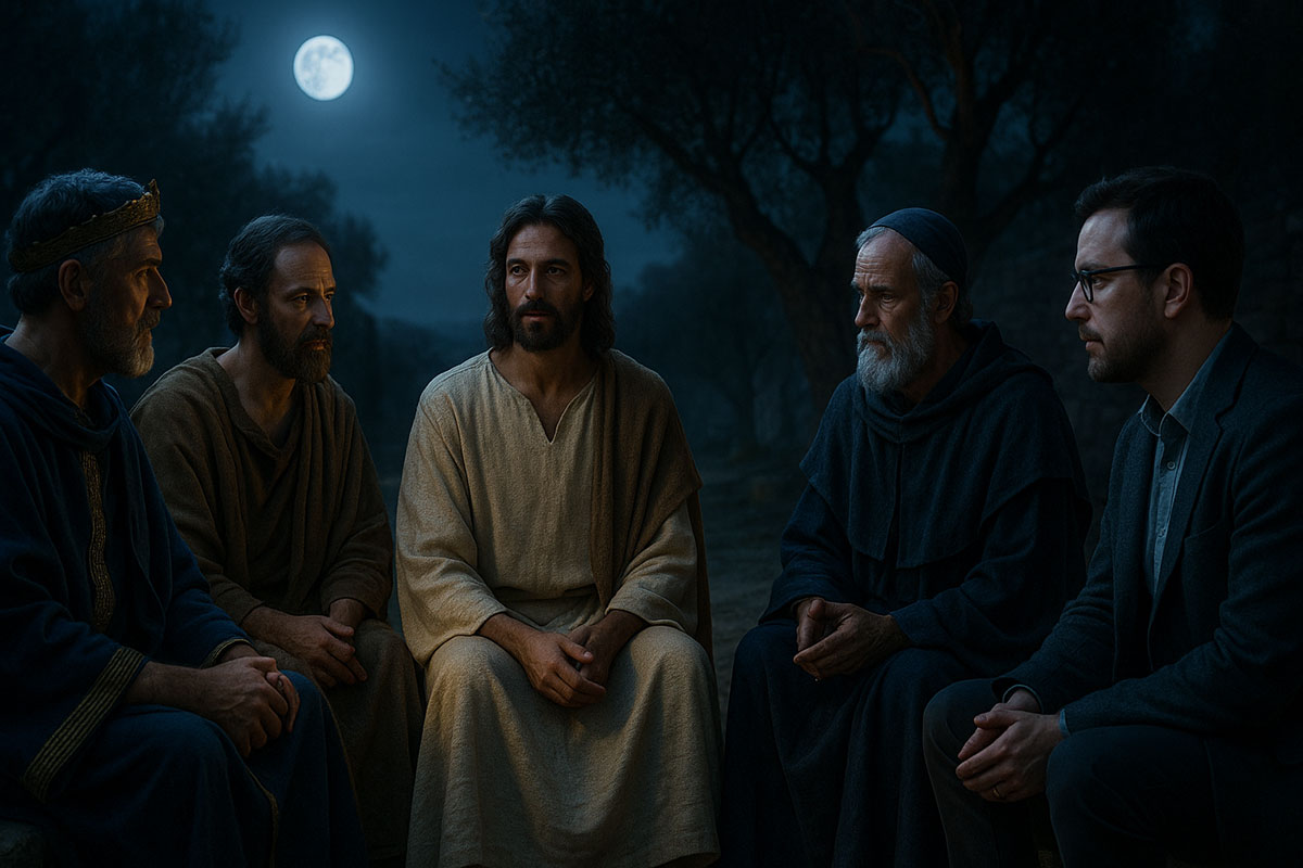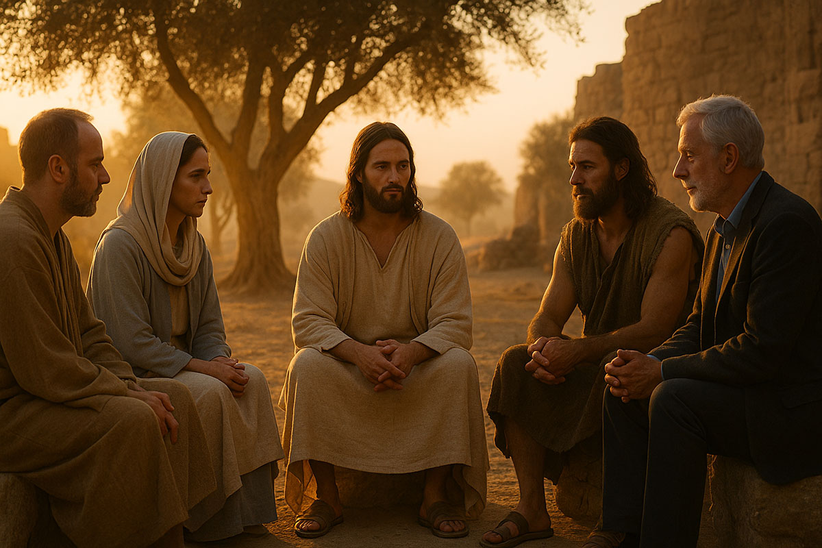 Mary Magdalene stood at the center, peaceful and grounded, her voice warm as she welcomed the five gathered around her: Jesus, Paul the Apostle, a Jewish historian, a modern theologian, and a seeker representing today’s searching soul.