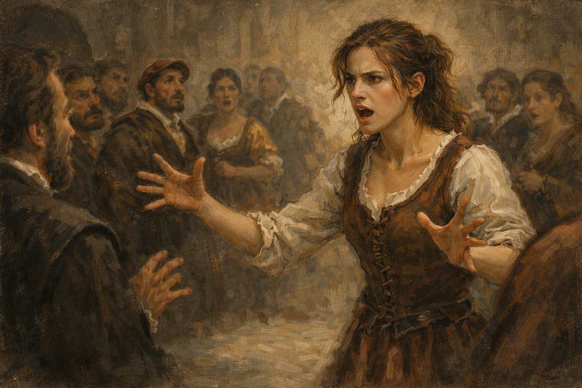 The label does a lot of work. Katherina speaks when she’s angry. She refuses to soften her tone for male comfort. In a society that expects women to be agreeable, that alone is enough to mark her as dangerous. Calling her a “shrew” converts resistance into pathology.