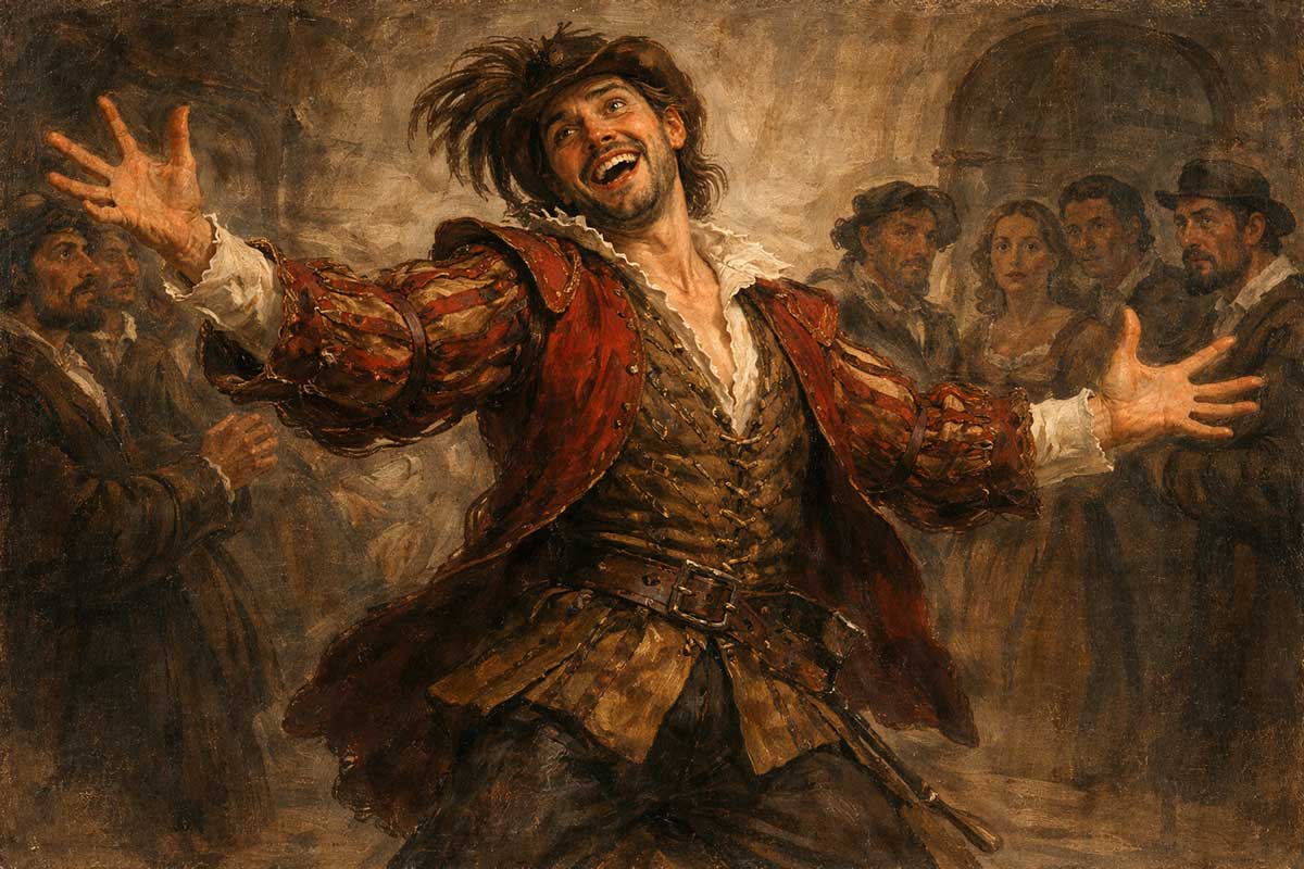 And he behaves as if he’s stepped into a role already written for him. His language is exaggerated, theatrical, deliberately excessive. That’s a clue. Petruchio doesn’t just dominate Katherina; he performs dominance. He understands that authority in this society is something you stage, not something you quietly possess.