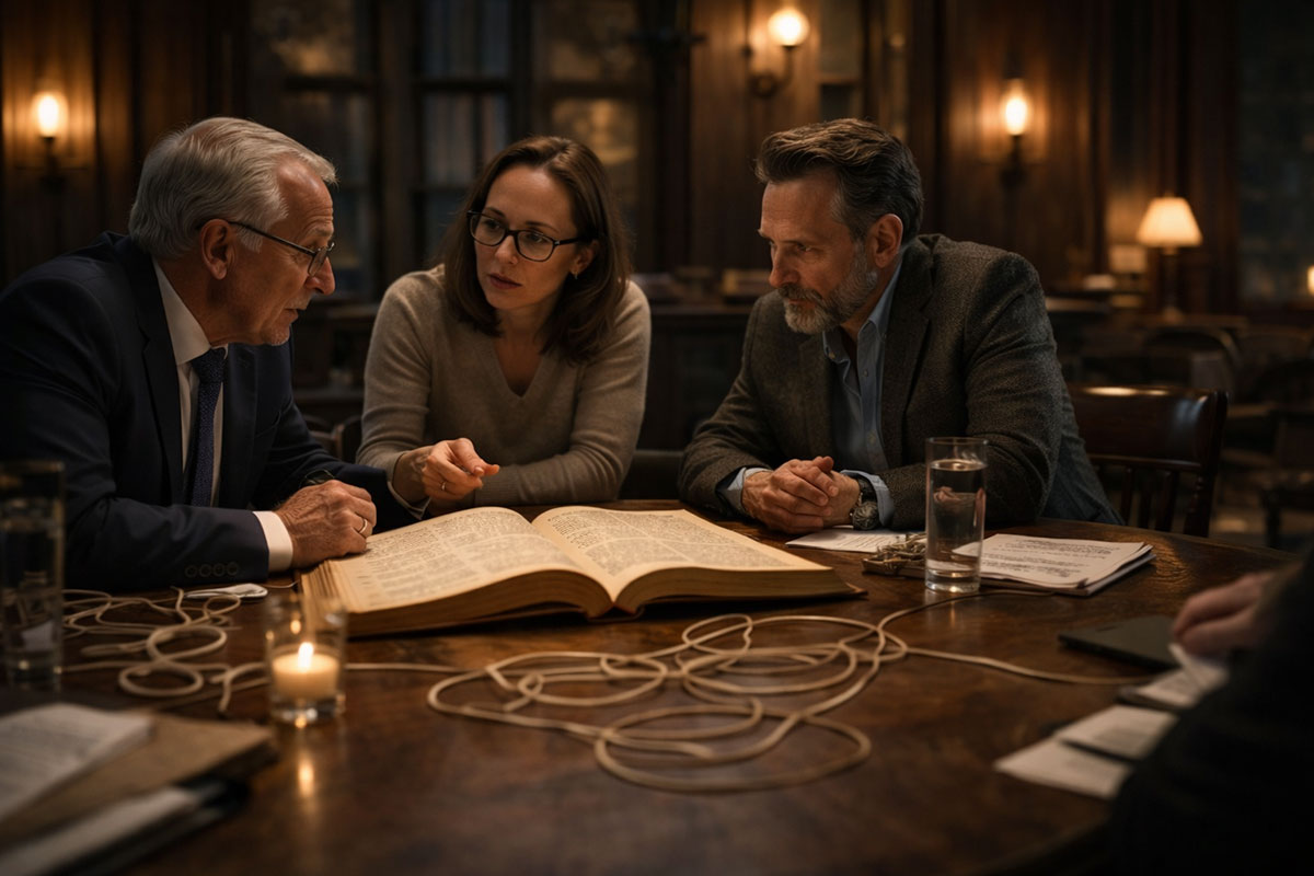 A stone library that feels older than the nations being discussed. A long oak table. Lamps with warm pools of light. Outside, rain taps the windows in a steady rhythm, like a metronome insisting on precision.