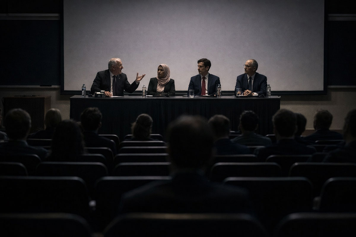 A quiet auditorium that feels more like a university lecture hall than a political stage. The lights are low, the mood is clinical. A large screen behind the panel shows no images, just a blank dark field, as if the room is refusing to be persuaded by spectacle.