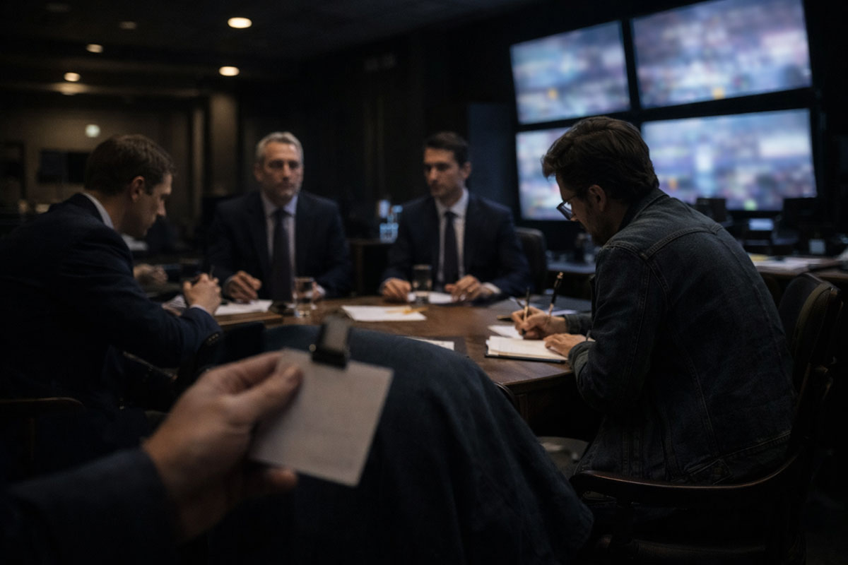 A quiet TV studio after hours. The cameras are off, the LED wall is dark, and the only light comes from a desk lamp and the city glow through the window. It feels like a place where people can finally say what they really think, without having to perform certainty.