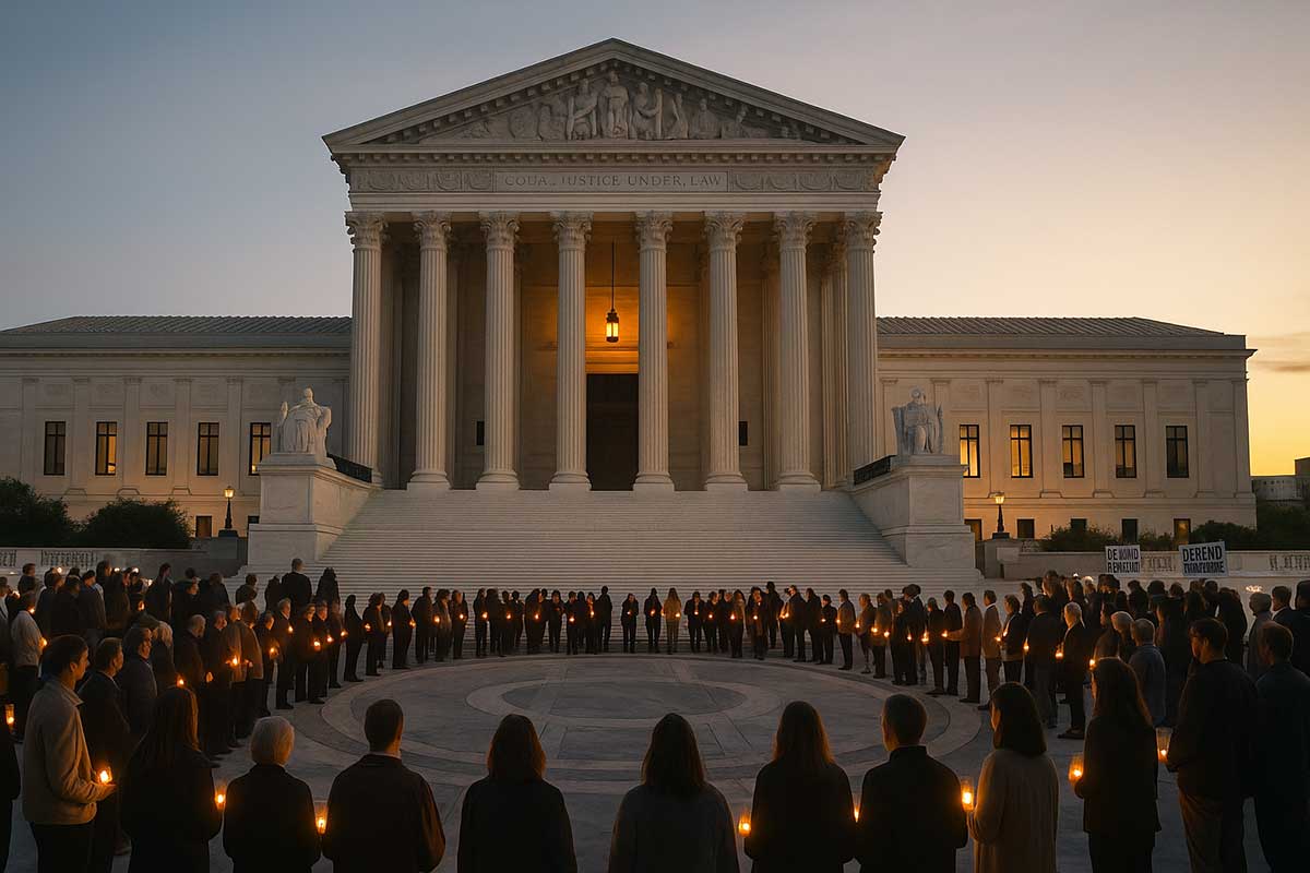 amera rises above the Supreme Court; morning light spills across the reflecting pool, uniting shadow and dawn.)