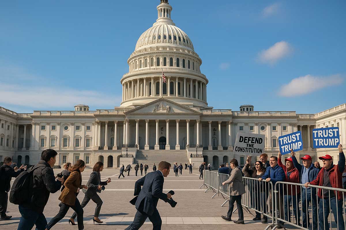 Protesters chant both sides of the street. A banner flaps: “TRUST THE PEOPLE.” Another answers: “TRUST THE CONSTITUTION.”
