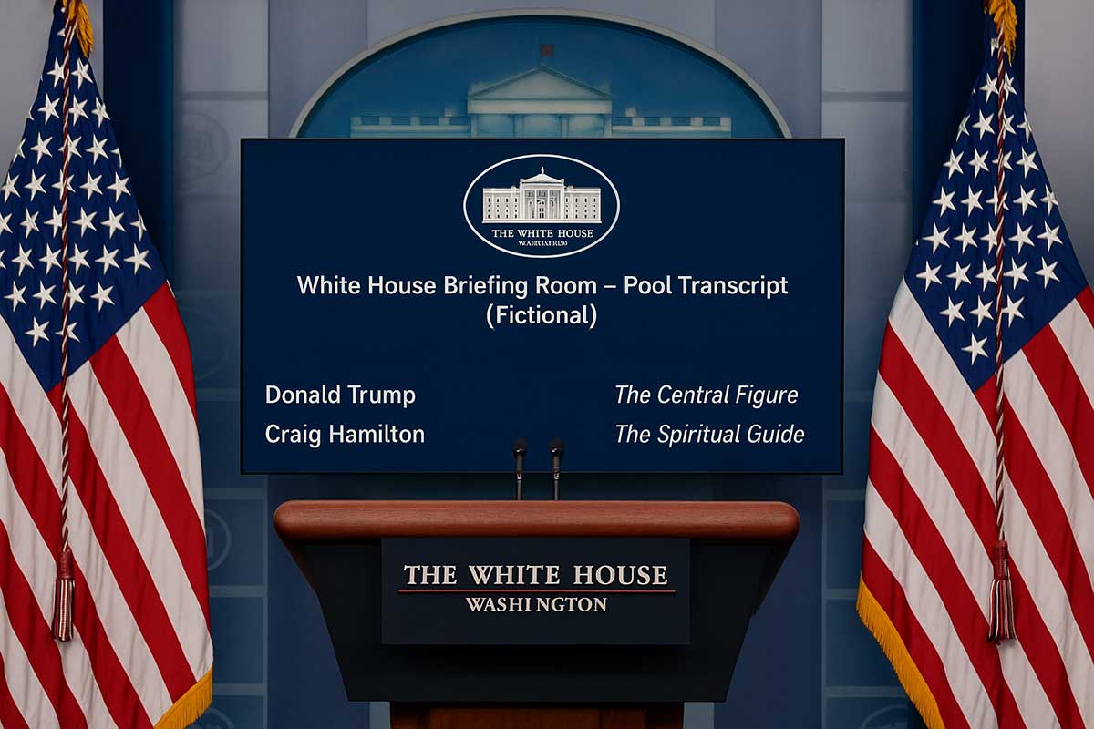 (The seal glows under cool lights. Reporters murmur as camera tally lights blink on. The Press Secretary steps to the lectern, binder in hand. Two aides stand against the side wall. The room settles.)