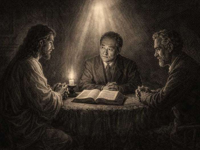 Nick Sasaki sat at the center of a quiet room that felt half like a study and half like a chapel—warm wood, a single lamp, and an open Bible on the table, not as a prop but as a shared point of gravity. No microphones. No stage. Just presence.